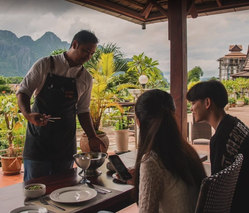 We eat as many Lao families do: close to the earth, close to each other. This is not a rejection of the table, but a reminder that belonging takes many forms.